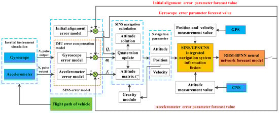 At present, multiple source information fusion is an important means to improve navigation accuracy. The overall error estimation scheme of the RBM-BPNN method is designed based on SINS/GPS/CNS integrated navigation system information to effectively estimate and identify SINS error parameters of aircraft, as shown in Figure 1. Where and represent the accelerometer pulse output and the gyroscope pulse output, respectively [24]; and represent the specific force and the angle velocity after error compensation, respectively; represents the initial value of quaternion; represents the attitude matrix between the inertial coordinate and body coordinate.