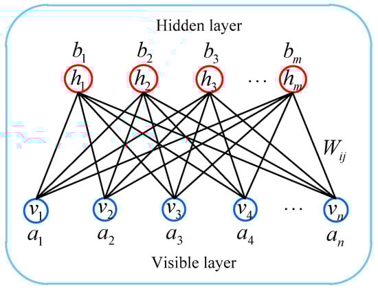 Where represents the number of neurons in the visible layer, and represents the state of the visible units; represents the number of neurons in the hidden layer, and represents the state of the hidden units; represents the connection weight between the visible layer and the hidden layer; and represent the biases of the visible layer and the hidden layer, respectively. For a given state , the energy function of RBM network model is defined as follows: