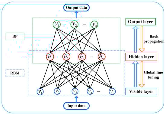 To overcome this difficulty, Hintion proposed a contrast divergence (CD) algorithm to effectively solve the problem of RBM learning efficiency [26]. The expectations in Equation (13) are approximately estimated by using the CD algorithm, and the calculation results of the partial derivative are expressed as follows: