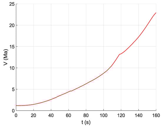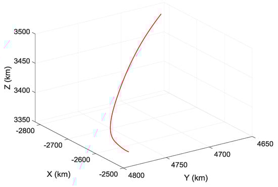 This study aims to take high-speed and high-dynamic aircrafts as the research objects, such as ballistic missiles, hypersonic vehicles, and realize the error parameters estimation of SINS during the ascent phase flight of aircraft. Suppose that the aircraft employs a three-stage rocket to achieve flight, aircraft flight time of ascent phase is s, and SINS navigation cycle is 0.02 s. To generate signal excitation to SINS and realize the effective estimation of error parameters, the standard flight path of ascent phase of aircraft is designed in geocentric coordinate, as shown in Figure 4. Figure 5 shows the velocity curve of the aircraft in inertial coordinate.