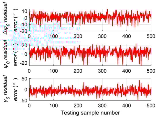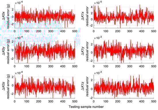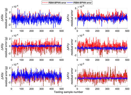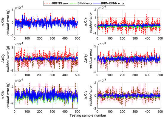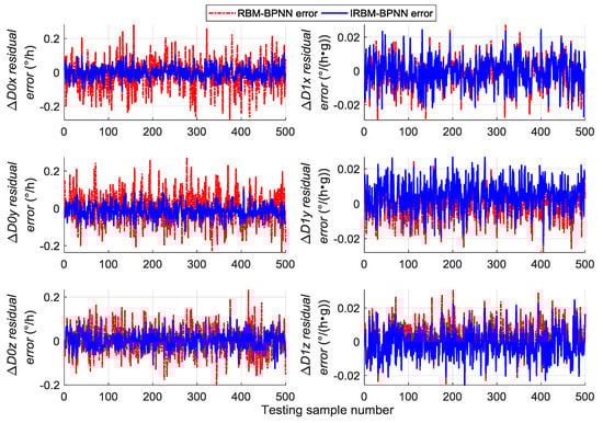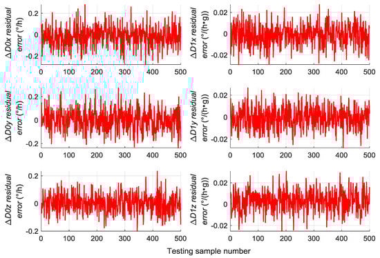 A total of 500 groups of data are randomly generated similar to Section 5.2 to verify the generalization capability of the trained RBM-BPNN structure, which are used as testing samples to evaluate the trained RBM-BPNN structure. According to simulation and calculation, the simulation results of initial alignment residual error using RBM-BPNN method is shown in Figure 7, the simulation results of gyroscope residual error using RBM-BPNN method is shown in Figure 8, and the simulation results of accelerometer residual error using RBM-BPNN method is shown in Figure 9. The residual error is the deviation between the actual value and the forecast value. Statistical results of error parameter forecast values using RBM-BPNN method are shown in Table 2.