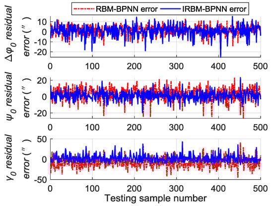 Next, the error parameters of the above 500 groups of test samples are forecasted by the IRBM-BPNN method to verify the feasibility of the proposed method. After simulation experiments, the residual errors of the error parameter forecast values using RBM-BPNN method and IRBM-BPNN method are shown in Figure 10, Figure 11 and Figure 12. Table 3 shows the statistical results of error parameter forecast values using IRBM-BPNN method.
