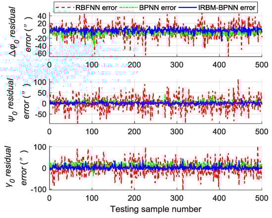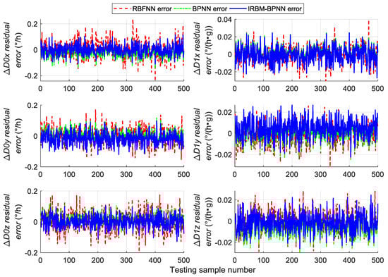 Comparative experiments are performed under the same simulation conditions, and the inputs and outputs of the training sample are consistent with Section 5.4 to further verify the effectiveness and feasibility of the IRBM-BPNN method in forecasting SINS error parameters. The RBFNN method and BPNN method are introduced as the comparative reference, and the radial base function of RBFNN is chosen as the Gaussian function. The statistical results of error parameter forecast values of testing samples by using the RBFNN method, BPNN method and IRBM-BPNN method are shown in Table 4. The residual error results using the three methods are shown in Figure 13, Figure 14 and Figure 15.