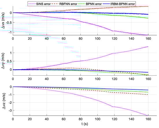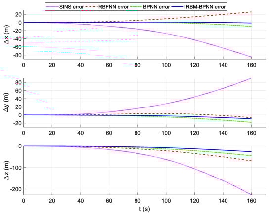 As shown in Figure 16, Figure 17 and Figure 18, the attitude error, velocity error and position error are smaller than the pure SINS navigation error after the compensation and correction of the error parameters by the artificial neural network method. Therefore, the artificial neural network method can effectively improve the navigation accuracy of aircraft. As shown in Table 6, the RMS errors of attitude of the IRBM-BPNN method are less than 15″, which are smaller than the attitude errors of pure SINS navigation and the smallest among the attitude errors of the RBFNN method and BPNN method. The RMS errors of position and velocity of the IRBM-BPNN method are less than 15 m and 0.25 m/s, respectively. Obviously, the navigation errors of the IRBM-BPNN method are the smallest compared with the RBFNN method and BPNN method. Therefore, the IRBM-BPNN method has the optimal navigation accuracy.