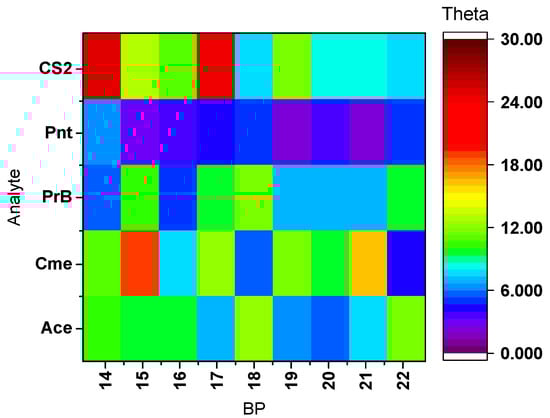 Figure 3. A theta heat map of polymer/analyte interactions compared to the control (Ctr). Analytes studied: acetone (Ace), cumene (Cme), propylbenzene (PrB), pentane (Pnt), and carbon disulfide (CS2).