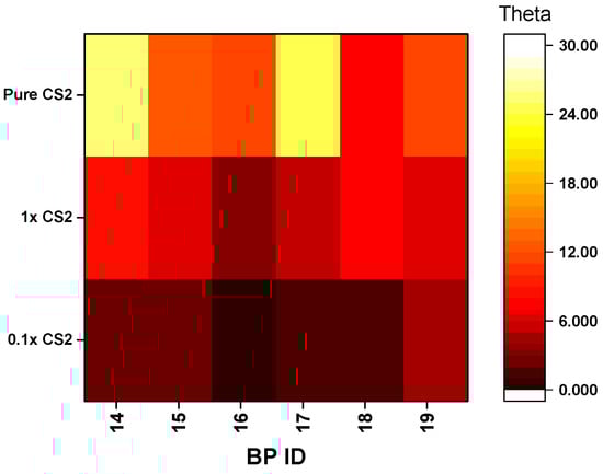 Figure 4. Stepwise increase of theta values upon increasing the concentration of CS2 for six of the barcoded polymers (BPs).