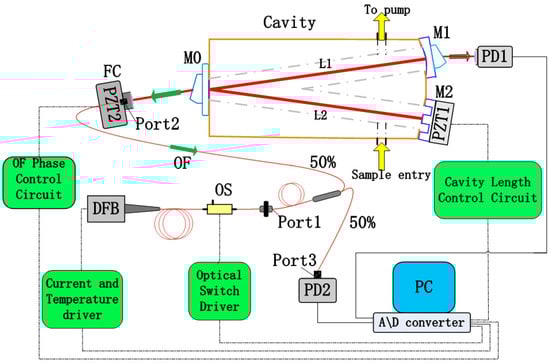 The established near-infrared OF-CEAS experimental setup is schematized in Figure 1. Here, the light source is a fibered DFB laser diode in a 14-pin butterfly package (SWLD-1531.5-15-PM, Allwave Lasers, Xi’an, China). It is housed in a universal laser diode mount (LM14S2, Thorlabs, Newton, NJ, USA), and its emission is centered at 1531.6 nm. It should be noted that this fibered diode does not include an optical isolator which would prevent the optical feedback from the V-shaped cavity.