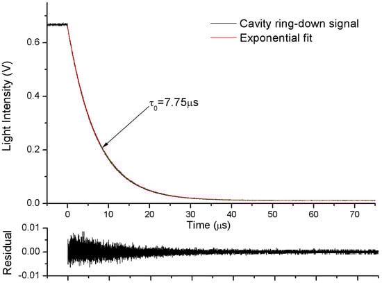 Measurement of the ring-down time (τ0) of the empty cavity is necessary before computing the absorption coefficient spectra of the sample gas. In this experimental setup, an efficient exponential decay cannot be obtained by shutting down the laser current driver due to its limited bandwidth (250 kHz). This procedure is accomplished by using a square pulse to make the driver of optical switch interrupt the laser instantaneously (10 ns). The laser is instantaneously switched off and the resonance light decays exponentially. The fast ring-down decay is recorded by a high sampling rate digitizer (CS320A, 100 MHz, Cleverscope, Auckland, New Zealand), and ring-down time was calculated by an exponential fit, as shown in Figure 2.