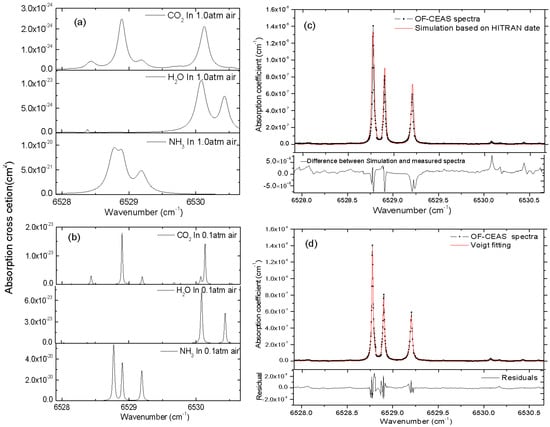 Figure 3a,b show the cross-section of NH3, H2O and CO2 at the temperature of 296 K and a total pressure of 1.0 atm and 0.1 atm, respectively. Absorption cross-section σ is simulated from the parameters given in the HITRAN database taking into account pressure and temperature []. As Figure 3a,b demonstrate, the absorption lines of NH3 are not easily identified at a total pressure of 1.0 atm, owing to the overlap of the neighboring absorption lines of ammonia itself, carbon dioxide and water vapor. By reducing the total pressure of sample gas, the linewidth of each absorption line turns to be narrower, and the interference caused by adjacent absorption lines is approximately eliminated. As shown in Figure 3b, the absorption line centered at 6528.77 cm−1 (cross-section σpeak = 5.3944 × 10−20 cm2) is the optimal option for NH3 detection in this region. The absorption coefficient spectra of 10 ppm of NH3 in N2 computed from HITRAN 2012 data [] are also shown for comparison in Figure 3c.