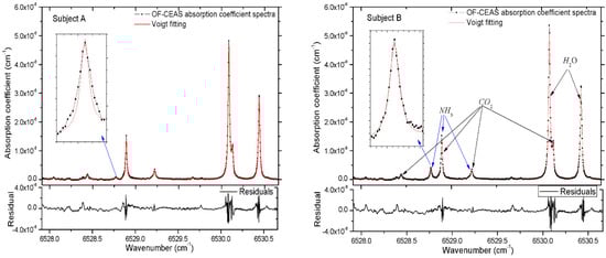 Finally, we demonstrate two spectra of exhaled human breath gas samples in Figure 4, which are taken from a healthy subject and a subject suffering from Helicobacter pylori infection. The samples of each subject were exhaled into a 10 L Tedlar bag through a disposable mouthpiece, and then the sample was regulated to flow through the V-shaped cavity at a flow rate of 0.1 L/min. The internal pressure is fixed to 0.1 atm by two pressure regulators, which are placed at the input and output of the cavity, respectively. The absorption spectra shown in Figure 4 indicate that the NH3 absorption line at 6528.77 cm−1 is sufficiently isolated from H2O and CO2 lines, which are the major interferences in exhaled human breath gas (about 4% CO2 and 3% H2O). The Voigt profile is applied to the fitting of each experimental absorption line, during the fitting process, all parameters of the Voigt profile are floated except the Doppler width, which is a fixed value for the gas with a specific temperature.