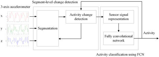 The first step of a typical activity recognition process entails collecting raw signals from the inertial sensors. This study only considers accelerometers but the results can be extended to time-series data from other sensors such as gyroscopes, magnetometers, and electrocardiography sensors. The total acceleration signals collected from the accelerometer are separated into body acceleration and gravity acceleration components. The proposed method uses the total acceleration data for segment-level change detection and the set of total acceleration and body acceleration data for activity classification using FCN.