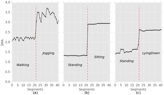The SMA calculated for each segment of accelerometer signals is shown to illustrate activity transitions in Figure 2. These results show that the inter-activity variation of SMA is greater than its intra-activity variation. Rather than achieving accurate activity classification, the goal of change detection using SMA is to capture the moment at which activity change occurs. Therefore, SMA would be a good choice to identify changes in activities.