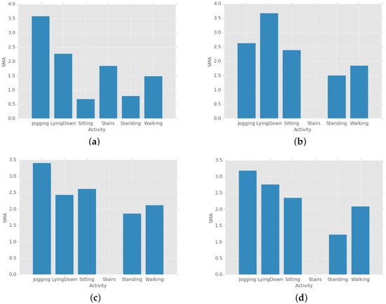 Figure 3 shows examples of the average SMA values of the activities of four subjects calculated using a public dataset [26]. The dataset was constructed by using smartphones to collect signals in uncontrolled environments and were gathered from 563 individuals. Figure 3 indicates that the SMA values are a good measure to distinguish the different activities even though the SMA values of the same activity can vary among subjects.