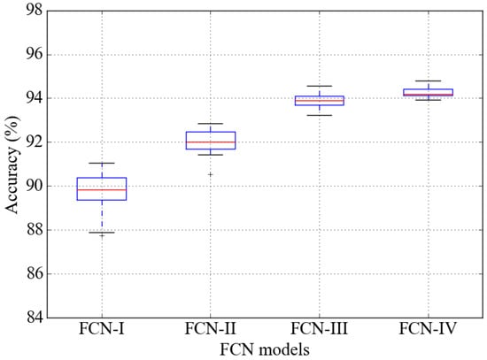 The performance of the FCN models is compared in Figure 5. We measured the performance by applying 10-fold cross-validation and the mean accuracy is indicated by the red rectangles in the figure. The experimental results show that the deeper networks achieve a higher activity recognition rate. We adopted the FCN-III model as the activity recognition engine of our proposed method because it showed similar performance to the FCN-IV model despite having fewer network parameters.