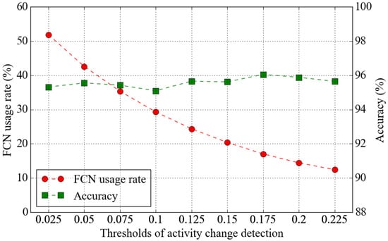FCN usage rate and accuracy of activity recognition according to the thresholds of activity change.