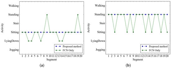 Exploration of the effectiveness of segment-level change detection requires continuously collected data that contain the activity change. However, because the dataset used for measuring the performance of activity classification is partitioned without considering the order of the data, we used all the data of the WISDM dataset containing the recordings of 563 individuals. We compared the recognition rates of activity classification methods according to whether classifiers and segment level change detection are applied. We used the FCN and CNN model as classifiers and selected the models closest to the average recognition rate of cross-validation, respectively. The activity classification results of the proposed method are provided in Table 3. In Table 3, “Accuracy for test data” means the test result of 10-fold cross-validation. The experimental results show that the recognition rate of the proposed method is retained when activity change is adopted. The ratio classified by activity change detection was 86% and this means that classifying human activities continuously in a short cycle is highly inefficient; moreover, activity change detection using compact features with low computational complexity can largely replace the use of a classification algorithm based on deep learning to reduce the computational complexity and energy consumption. In addition, activity change detection can reduce the number of false positives classified by the FCN model because it has a smoothening effect on the activity recognition results, as shown in Figure 7. This figure shows that continuous activity is sometimes misclassified by FCN models, but the proposed method ensures continuity of action.