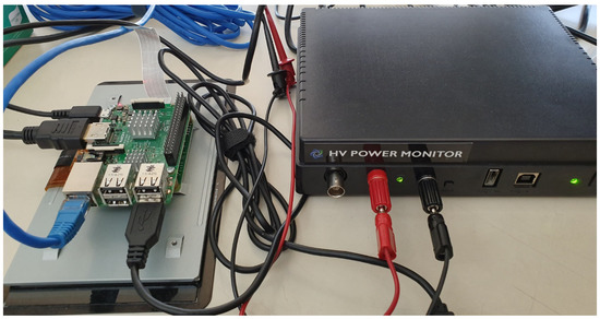 A user activity must be monitored over a long period of time, which is inefficient in terms of energy consumption. However, the need to frequently recharge monitoring devices can result in user dissatisfaction. Thus, energy consumption needs to be taken into account when methods using deep learning are deployed in embedded devices. This led us to explore the energy consumption of the activity recognition method based on deep learning on embedded platforms. We used two embedded platforms, namely Raspberry Pi 3 with a 1.4 GHz 64-bit quad-core processor and 1 GB RAM, and the Jetson Nano with a 1.4 GHz quad-core 64-bit CPU, a 128-core integrated NVIDIA GPU, and 4 GB RAM. The Jetson Nano has two power modes, i.e., a 5-Watt mode for supporting limited power and a 10-Watt mode for maximizing the performance. The energy consumption of the activity recognition methods running on embedded platforms was measured using the Monsoon power monitor tool. The experimental setup for measuring energy consumption is shown in Figure 8.