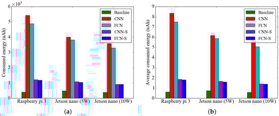 The energy consumption of the activity recognition methods is calculated by measuring the amount of energy used to process all of the segmented data in the WISDM dataset. Therefore, we consider all subjects in the WISDM dataset. The proposed system emulates the sensor by using the public dataset because the proposed system does not gather data from the IMU sensor directly. To mimic the sensor, the proposed system reads the sensor data from file and then, feeds the sensor data to the activity classification method. Thus, we first measured the energy consumption by the operating system and the energy consumption by the process emulating the IMU sensor. We refer to this energy consumption as the baseline energy consumption (baseline). Subsequently, we compared the energy consumption of the FCN-based method with that of the CNN-based method by excluding the baseline energy consumption. Finally, we measured the energy consumption by the CNN-based and FCN-based methods with segment-level change detection. Throughout this section, we refer to the CNN-based method with segment-level change detection as CNN-S and to the FCN-based method with segment-level change detection as FCN-S. We also measured the processing time of the activity recognition methods on the embedded systems.