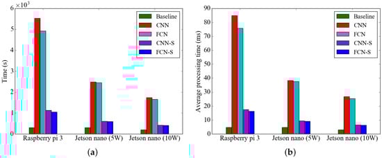 The processing time of the activity recognition methods on the embedded platforms is shown in Figure 10. The total processing time of the activity recognition methods is the time required to process all 65,067 of the segmented data points in the WISDM dataset. We measured the processing time of IMU sensor emulation, which reads the sensor data from the file and feeds the sensor data to the activity classification method. We refer to this processing time as the baseline processing time (baseline). As shown in Figure 10a, the activity recognition method using the CNN model requires a minimum of four times more processing time than the proposed method. Figure 10b shows that the proposed method can process sample data collected for a period of 2.25 s on a high-end embedded platform in an average of 6.3 ms and requires an average of 16 ms on a low-end embedded platform. The experimental results confirmed that we could reduce the energy usage significantly while maintaining the recognition rate of human activity by optimizing the entire HAR system as a result of implementing segment-level change and FCN.