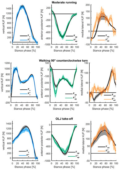 Mean (and standard error) of the estimated three-dimensional (3D) knee joint forces (KJF) (, and ) for moderate running (top), walking a 90° counterclockwise turn (middle), and one-leg horizontal jump (OLJ) take-off are presented (normalized to the stance phase), compared to their respective reference values (inverse dynamics-calculated knee joint forces Fv, Fap, and Fml).