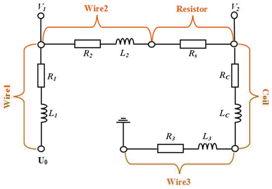 wherein, I is the current in the circuit, is the divider resistance, and are equivalent resistance and inductance of coil. and are the equivalent resistance of circuit, and Wire2 and Wire3 are connection wires of sensor, series resistance, and data acquisition card. and are the equivalent inductance of Wire2 and Wire3. , , , , and should be measured in advance before measurement and substituted as known quantities into data processing program to calculate the divided voltage on the sensor coil Vc. Inductance of connecting wires in the circuit were much smaller than , so and can be ignored, and were measured by LCR (inductance, capacitance and resistance) meter both as 0.86 Ω, while was measured as 10.1 Ω.