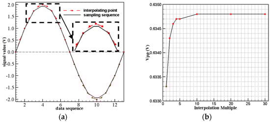 There is peak detection error caused by the discontinuity of collection signal as Figure 4a shows. So, the interpolation is used to increase the peak detection accuracy. Figure 4b is the comparison of the peak value with different interpolation multiples. It is proved that interpolation can efficiently increase the accuracy of peak detection and the tenfold interpolation is sufficient to obtain the effective peak result.