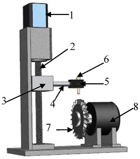 The calibration device, as Figure 8 shows, mainly includes position controller and rotator. The displacement slider is driven by the screw which is controlled by stepping motor. The precision of position controller is 1 μm and its control range is 13 mm. The calibration target is an 18 mm width and 1.5 mm thickness blade, and the target material is Inconel 718 which is one of the turbine blade materials. The excitation signal in the calibration experiment was 4 MHz and 3 Vpp sinusoidal AC signal generated by Agilent Keysight 33600A (Agilent Technologies Inc., Santa Clara, CA, USA).