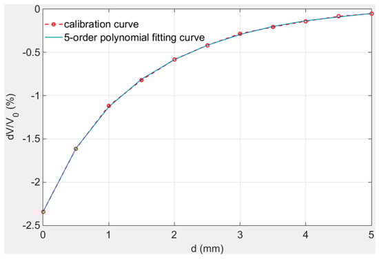 The calibration result is shown in Figure 9. The measurement curve was composed of 11 measuring points, therefore, a suitable formula is needed to express the curve in the full range. The five-order fitting curve has the best fitting degree and it represented the calibration result smoothly. Other lower order fitting curve may produce errors in individual positions. Equation (8) is five order fitting formula of calibration curve and its fitting degree R2 is 0.9992. The measurement data near 5 mm is listed in Table 2.