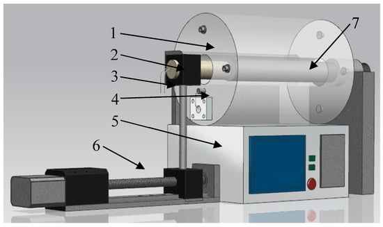 Hightemperature calibration setup. (1—heater,2—sensor,3—sensor lead wire, 4—thermocouple, 5—temperature controller, 6—position adjuster, 7— target).
