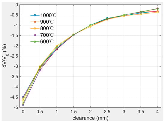 The calibration experiments at high temperatures were carried out in the range of 600 °C–1000 °C and the calibration range was 0 mm–4 mm with 50 μm step length. The calibration results are plotted in Figure 13 and as it shows, excepting the start point 0 mm and end point 4 mm, the curves have high coincidence especially in the range of 1 mm–3 mm. The range of calibration values at different temperature varied from −5.0% to 0% and the variation within 0 mm–2 mm was closed to 2.0%/mm.