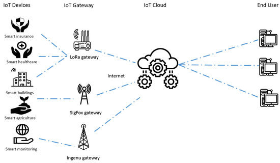 Long-range commercial solutions shown in Table 1 share the common network architecture in Figure 1. IoT devices transmit their data to a brand-defined gateway through a technology acting at the data link and physical layers where IoT application data are directly encapsulated. All involved protocols are strictly brand defined. Each gateway is a protocol converter encapsulating the private IoT application into an Internet protocol stack to be conveyed to the IoT cloud where a brand-defined server will apply an application layer conversion from the IoT application to an Internet application protocol (such as HTTP) suitable for end users.