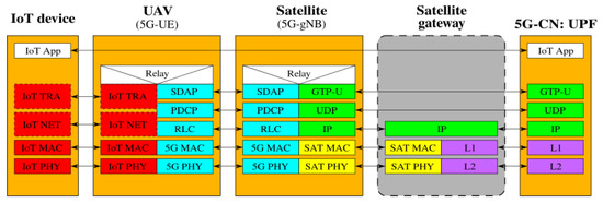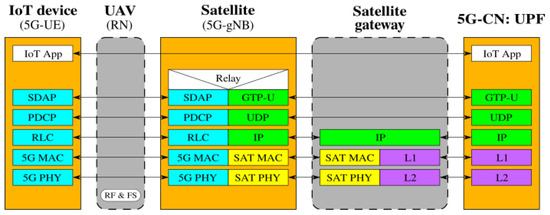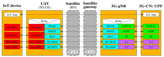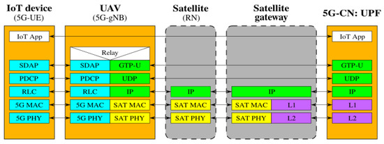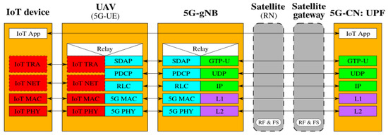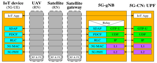 5G-UE in the IoT device, UAV and satellite as RNs, and terrestrial 5G-gNB.
