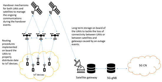 - Handover: UAVs may change their position by following a predefined path, and also, satellites do not always cover a fixed area if they are non-geostationary satellites. This situation implies that an IoT device cannot always be linked to the same UAV, and a UAV is not always linked to the satellite. Proper handover mechanisms are required to manage ongoing communications during these different kinds of handover events.