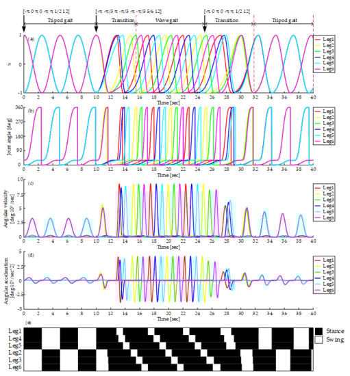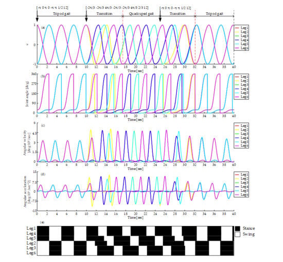 - Yu, H.; Gao, H.; Ding, L.; Li, M.; Deng, Z.; Liu, G. Gait generation with smooth transition using CPG-based locomotion control for hexapod walking robot. IEEE Trans. Ind. Electron. 2016, 63, 5488–5500. [Google Scholar] [CrossRef]