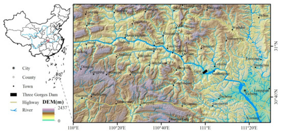 In order to evaluate the ability of LJ1-01 to detect the feeble NTL, a suitable study area is essential. First of all, we cannot choose NTL images from economically developed urban areas, because the NTL of these places is often bright. Secondly, it is better not to select images from the plains, as the high population density in these places often leads to an excessive NTL brightness. Both factors considered, the key monitoring area around the Three Gorges Reservoir in China was selected as the study area. The Three Gorges Reservoir is located at the junction of China’s second and third elevation steps, where average elevation rises from less than 500 m to 1000–2000 m. This reservoir is one of the largest water conservation projects in the world, with a total storage capacity of 39.3 billion cubic meters. The total area of artificial lakes created by the Three Gorges Dam is 1084 square kilometers, and the project forced more than 1 million residents to relocate. The study area, which is shown in Figure 1, is located along the Yangtze River from Yichang City to Badong County. Due to the inconvenient transportation, the local economy is underdeveloped, even lower than the national average level. Most of the study area is mountainous, therefore the local population density is low. According to the China Population Spatial Distribution Kilometer-grid Dataset in 2015 [32], the minimum population density of the study area is 67 people/km2, the maximum density is 9682 people/km2, and the average density is 197 people/km2, which is much lower than the average population density in the plains of China (359 people/km2).