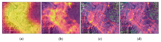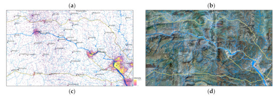 Sources of study area data: (a) DMSP NTL image; (b) VIIRS NTL image; (c) LJ1-01 NTL image; (d) Google Map image. When the NTL intensity or the DN value of the pixel is 0, the pixel is set to be transparent.