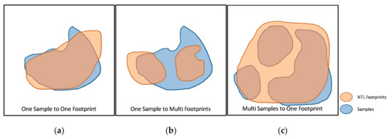 Spatial correspondence of NTL footprints and samples: (a) One sample to one footprint; (b) One sample to multi footprints; (c) Multi samples to one footprint.