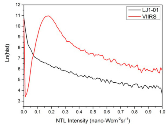 Histogram of VIIRS and LJ1-01 NTL images. The y-axis represents the logarithm of the number of pixels.