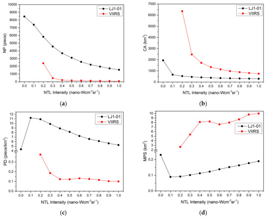 If the cutoff threshold is set too small, NP and CA will increase significantly, and the trends of PD and MPS will also be different from before. Therefore, the inflection of these indices’ curves will help to determine the optimal cutoff threshold to minimize the effects of noise. Figure 6 shows the changes in landscape indices as the cutoff threshold rise. Based on the above reasoning, the optimal threshold for LJ1-01 should be greater than 0.1, while the optimal threshold for VIIRS should be greater than 0.3 or 0.4.