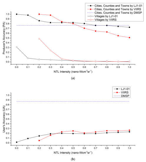The NTL from cities and counties is usually very bright, and it can be easily observed. However, the focus of this article is on feeble NTL. That is the reason why the number of samples for town and villages are much larger than that of cities and counties. When calculating accuracy, the city-level samples and county-level samples are counted in combination with town-level samples. Figure 7a shows that the DMSP images could not identify the village samples. However, the producer’s accuracy of DMSP images for the town and larger settlement samples is 76.5%. The producer’s accuracy of VIIRS and LJ1-01 images gradually decrease as the cutoff threshold increased. For samples at town-level and above, the producer’s accuracy of the LJ1-01 images is higher than that of the DMSP images when the cutoff threshold is less than 0.8. The same situation occurres with the VIIRS images when the cutoff threshold is less than 0.6. When the cutoff threshold of the LJ1-01 images is in the range from 0.2 to 0.6, the producer’s accuracy of LJ1-01 is similar to that of VIIRS with a cutoff threshold between 0.4 and 0.5. For village-level samples, the DMSP images cannot identify any village samples. The producer’s accuracy of VIIRS and LJ1-01 NTL images for village samples is very low, especially when the VIIRS cutoff threshold is greater than 0.4 and the LJ1-01 cutoff threshold is greater than 0.1. This indicates that DMSP images can only detect NTL of human settlements above the town-level. VIIRS and LJ1-01 NTL images could identify NTL from a small number of village-level human settlements, but the NTL of these settlements is so weak that it is very close to the systematic error and is easily confused.