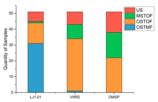 Due to the poor outcome of village-level sample detection, this paper only compares the spatial correspondence of NTL footprints and samples at town-level and above. One sample to one footprint (OSTOF) and one sample to multiple footprints (OSTMF) indicate that NTL patches have good separation, while multiple samples to one footprint (MSTOF) represent poor separation. Figure 8 shows the spatial correspondence of different NTL data sources under the optimal cutoff threshold. 44 of 51 samples with town-level and above could be separately identified using LJ1-01 images; only one sample is undistinguished. The spatial correspondence of the VIIRS and DMSP images is inferior to that of the LJ1-01 images. This can be attributed to the high spatial resolution of the LJ1-01 images, which generated a small overglow around the NTL emitted by human settlements. The overglow on the NTL image is usually appeared as a NTL patch, which size is larger than that of the real light source. Overglow may be caused by optical diffraction of the imaging lens and atmospheric scattering. A smaller overglow makes the target more distinguishable.