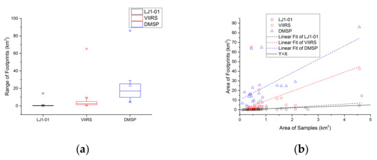 Figure 9a shows the area statistics of NTL patches identified by the town-level samples. The area of the NTL patches from the LJ1-01 images is relatively stable, but the area of the NTL patches from the DMSP images varies greatly.