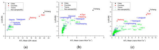 Total NTL intensity of footprints using different NTL data sources. The x-axis represents mean of footprints’ NTL intensity. The y-axis represents the logarithm of the total sum of the NTL: (a) Footprints of DMSP image; (b) Footprints of VIIRS image; (c) Footprints of LJ1-01 image. NS: non-sample, and the marks of the non-sample are consistent with that in Figure 11.