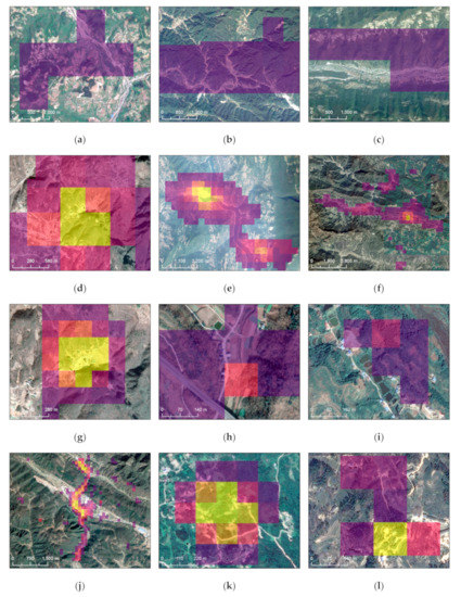 The non-sample patches on DMSP image are mainly linear in shape with low DN values. Considering that the distribution of these patches is consistent with the distribution of some roads (Figure 11a–c), they may be caused by traffic or some temporary engineering activities, such as roads maintenance. The non-sample patches with higher total sum of NTL on the VIIRS image are related to industrial activities (Figure 11d,e) and traffic such as highway G50 (Figure 11f). The non-sample patches with both higher total sum of NTL and NTL mean on the LJ1-01 image include industrial activities (Figure 11g), road traffic (Figure 11h,j), as well as some villages (Figure 11i,k,l).