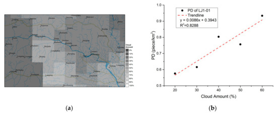 Comparing with the monthly and annual composites, daily NTL images from LJ1-01 exhibit many more fragmented patches. Some of these represent industrial activities or small human settlements such as villages, but more of them represent background noise. The size and number of NTL patches caused by noise are mainly determined by moonlight and cloud reflection. Brighter moonlight and more cloud will cause more noise. The intensity of moonlight can be estimated from the phase of the moon [44], and the amount of cloud can be obtained through the website of the National Meteorological Information Center [45]. The NTL intensity at the time of the LJ1-01 images in the study area is almost the same; the two scenes are observed at slightly less than one-half of full moon. Therefore, in this study, the main factor causing noise is the amount of cloud. After mosaicking the cloud map of the study area on 22 August 2018 and 3 September 2018 from 22:00 to 23:00, a map of the amount of cloud in the study area is generated and is shown in Figure 12a. The cloud percentages in most areas are between 20% and 60%. Figure 12b shows the linear relationship between the amount of cloud and the PD of the NTL patches in the LJ1-01 images in the study area. The correlation coefficient indicates that the amount of cloud is significantly positively correlated with the number of NTL patches that are considered to be noise. However, relying on daily data, it is difficult to eliminate the effects of noise.