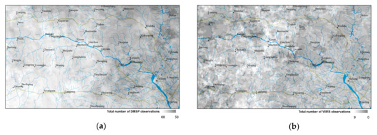 Image composition, resolution, and satellite overpass time are also key factors affecting sensor detection of feeble NTL. First, the image composition method is considered as the most important of these factors. Figure 13 shows an image coverage map of DMSP and VIIRS in the study area. Every pixel of the DMSP image is composed of from 50 to 68 scenes of daily data, while the pixels of the VIIRS image are based on 0 to 9 scenes. The greater the number of scenes composite, the less the noise in the image. However, it also blocks much the feeble NTL. This may be the reason why the DMSP images could identify only human settlements above the town-level, but the VIIRS images could show more human activities. At present, LJ1-01 provides only daily data, which contain not only the NTL emitted by human activities but also large amounts of system and background noise. An appropriate image composition method can help to filter out noise while preserving real human activities.