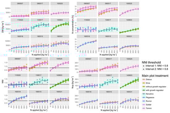 Saturation of vegetation indices is a frequently discussed limitation for the application of spectral methods in dense canopies [,]. This study aimed at assessing the estimation of DM, NC, NNI, and Nup under varying conditions. Dominated by the effect of N fertilization, positive trait ~ index relationships were found on all dates. An asymptotical negative NC ~ DM relationship was confirmed across dates, which was converted into the NNI [,].