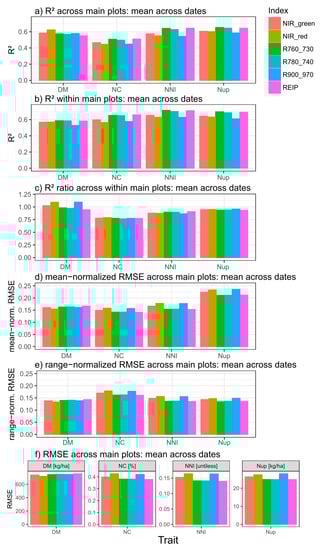 Several studies indicated a better detection of N traits than that of DM [,,,]. Red edge information is most suitable for estimating N status and was found to be superior over classical NIR/red indices such as the NDVI for DM for overcoming saturation []. The water band index was often suited for biomass estimation during the generative phase and may be used also at pre-flowering []. Simple ratio indices such as the R780_840 [] and the R760_730 [] were found to perform similarly or better than the REIP for N-related traits.