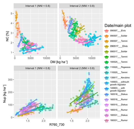 N concentration (NC) plotted against dry matter (DM) of both intervals, based on the NNI-threshold (NNI </> 0.8), and an example of the R760_730 relationships with Nup in both intervals for date*main plot combinations. Regression lines refer to linear fits within intervals. See Supplementary Figure S5 for coefficients of determination for the trait ~ index relationships.