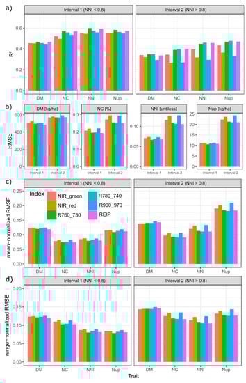 Compared by R2, RMSE as well as mean- and range-normalized RMSE-values, all traits were better estimated in the lower (interval 1) than in the upper (interval 2) NNI-based trait interval (Figure 6). In general, the order of the R2-values among traits was DM < NC ≈ NNI ≈ Nup in interval 1 and DM < NC < NNI < Nup in interval 2 (Figure 6a). Accordingly, the order by range-normalized RMSE was DM > NC > NNI ≈ Nup in interval 1 but DM > NC ≈ Nup > NNI in interval 2. However, the order by mean normalized RMSE was DM ≈ Nup > NNI ≈ NC in interval 1 and Nup > DM > NNI > NC in interval 2. For DM, all indices performed on average similarly in interval 1 (R2 = 0.45–0.47, RMSE = 480–520 kg ha−1; mean-normalized RMSE ≈ 12%) but differed more in interval 2 with the R900_970 being relatively less suited mainly due to the poor relationships during stem elongation in 2018 (Supplementary Figures S5 and S6). For all N traits, the REIP and R760_730 ranked highest (average R2 of the REIP = 0.40 for NNI, 0.46 for NC and 0.47 for Nup) in interval 1. In interval 2, the R780_740 reached slightly higher R2-values and lower absolute and normalized RMSE values than the R760_730. While the index discrimination was minor in interval 1, the R2, especially of the NIR_red and R900_970 in interval 2, was about 1/3 lower than that of the best-performing indices in interval 2. In spite of the overall weaker estimation in interval 2, the contrary was found for some date*main plot combinations, mainly in 2009 (Supplementary Figure S5).